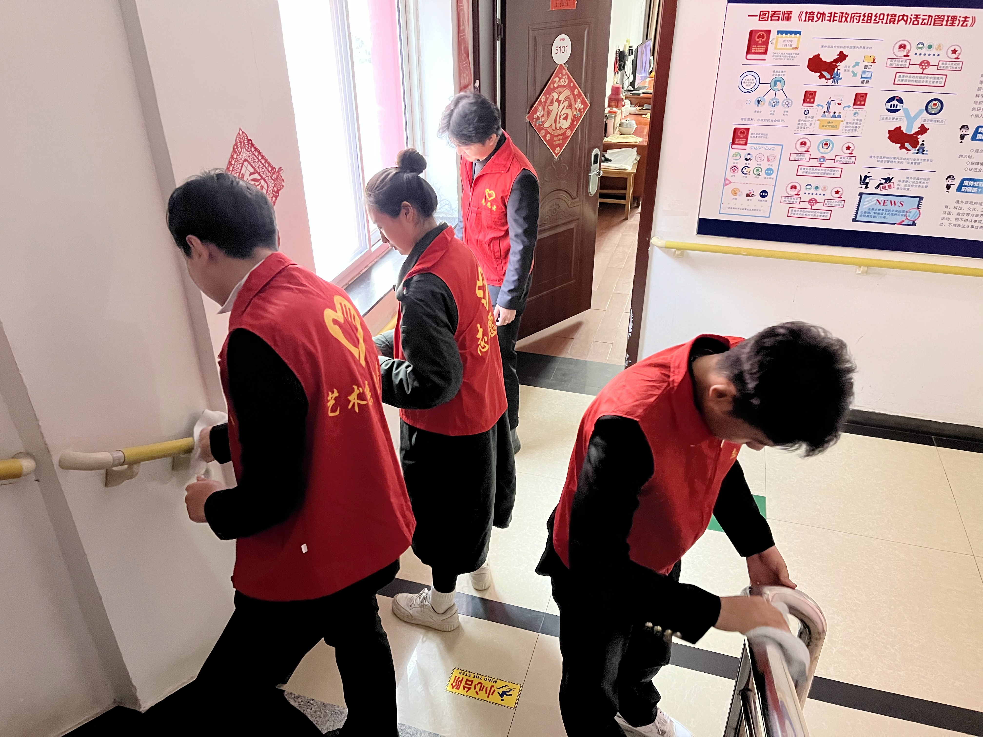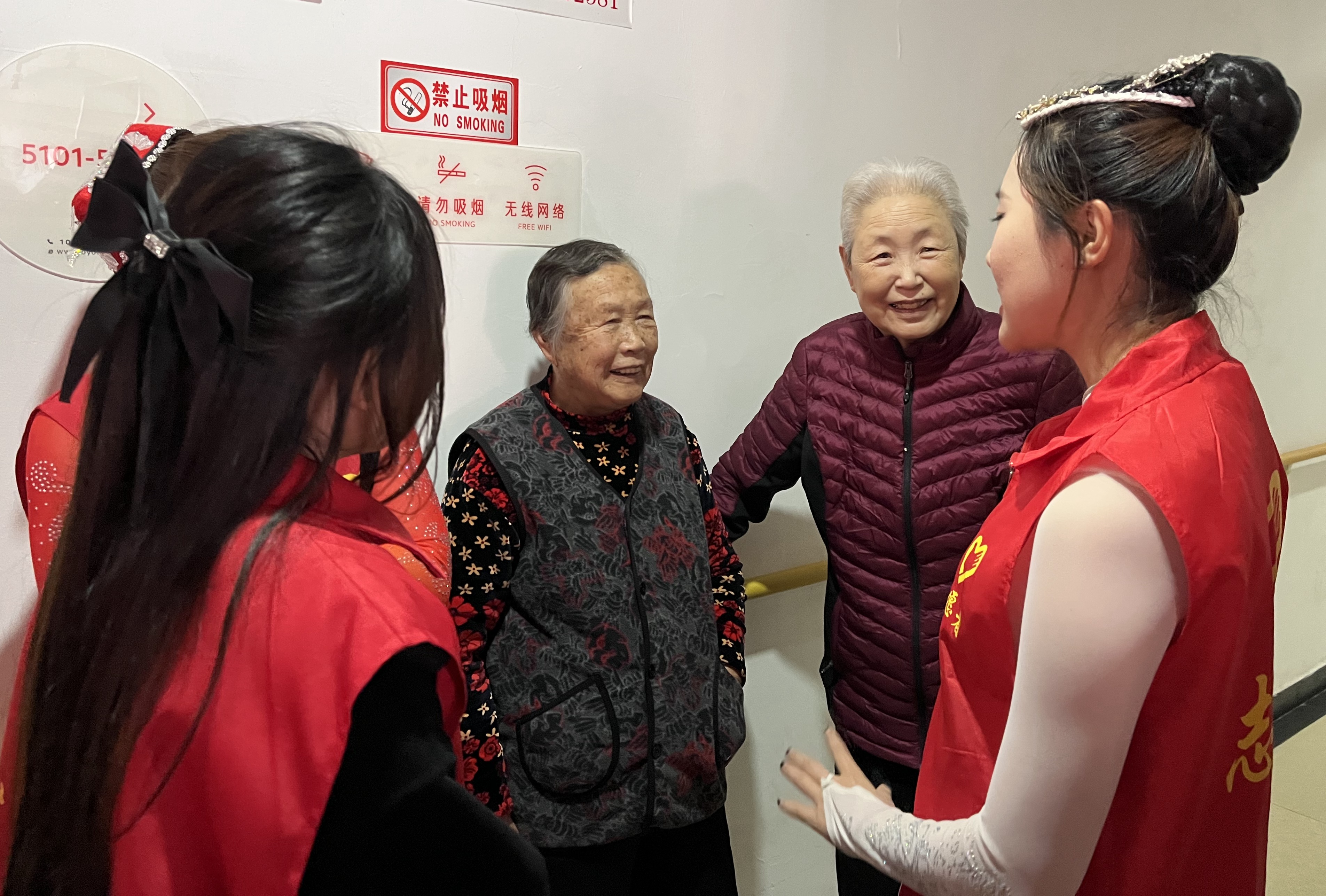 活动中,一段极具民族特色的舞蹈串烧开场,歌剧《长征》中的歌曲《三月桃花心中开》、小提琴演奏的《梁祝》、二胡演奏的《赛马》、《山丹丹花开红艳艳》,小合唱《领航》更是唱出了用青春和热血捍卫我们伟大的祖国。精彩的文艺表演拉近了志愿者与老人的距离。志愿者们为老人们送上水果、牛奶等慰问品,有的为老人们打扫卫生、整理床铺,有的和老人们拉家常,仔细询问他们的生活起居和身体状况,并叮嘱他们要保重身体,注意饮食。温馨的话语,贴心的问候,让老人们倍感温暖,现场一片祥和、温馨的景象。