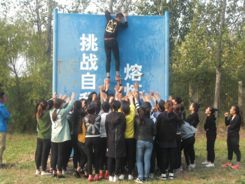 翻越“生死墙”是一个高4.2米的直墙,要求不借助任何外来力量,每一个人都要翻越这个“生死墙”。为了完成这个任务男生们用宽厚的肩膀为大家做底座形成一个人梯,最先上去的人探下身来去拉下面的人,下面的人尽量向上推,其余的人在周围做起了一层“保护气垫”,所有人都齐心协力,无一例外!