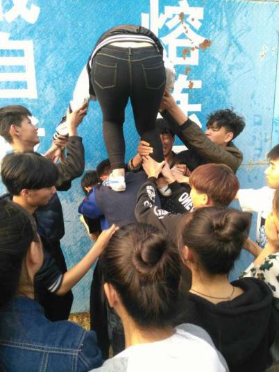 一开始大家都是抱着玩的心态,可是上高台的人越来越多,高台下面的人越来越少,最后一个人怎么办呢?大家都开始担心了,所有的同学集思广益,出了很多点子,第一次从上面把一个人放下来,希望下面的同学抓住这个人的脚踝,但是下面这个同学由于为前面上去的人耗尽了体力,已经无力完成这个动作。第二次有人自告奋勇从上面下来把这位同学托上去自己留在了下面。第三次从上面把一个瘦高的男生放下来,下面的同学奋力抓住了这个人的脚踝,在高台上面多位同学的齐心协力下,终于把这两名同学一起拉了上去。同学们攻克了难关,完成了任务,大家情不自禁的为自己的成功大声喝彩。