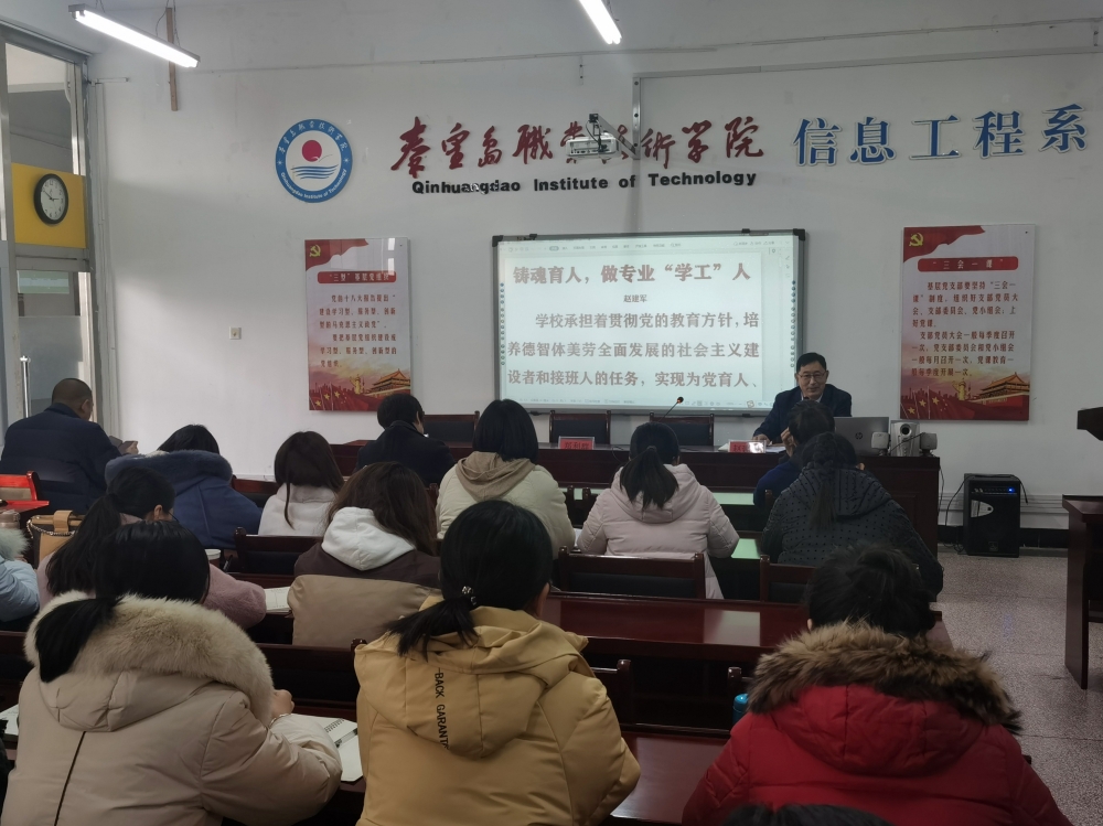 12月1日,学工部邀请信息工程系党总支书记赵建军为全院专兼职辅导员做了题为《铸魂育人,做专业“学工”人》的专题报告培训。学工部全体成员,各系学工办主任,专兼职辅导员参加。培训由学工部处长郑利群主持。