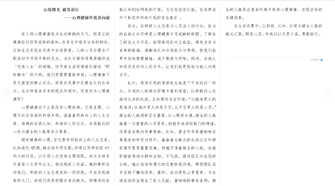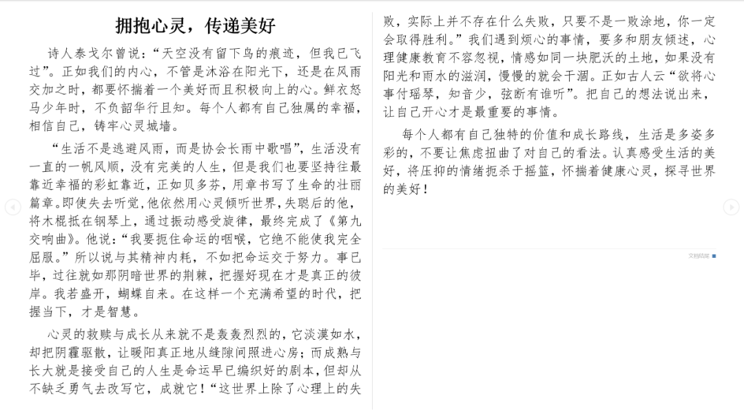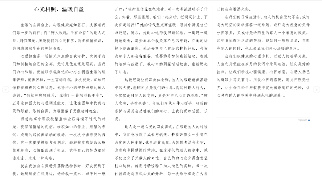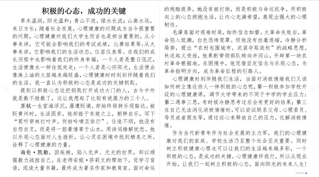 我们欣喜地看到,这次征文活动唤起了许多同学对自我和他人心理健康的关注,让越来越多的人愿意关注内心、倾听自我、分享感悟。相信未来我们的校园将会变得更加温暖,每个人的成长之路也将走得更加从容坚定。期待未来能有更多这样的平台,让我们继续用文字书写心理,在笔墨书香中寻找力量。