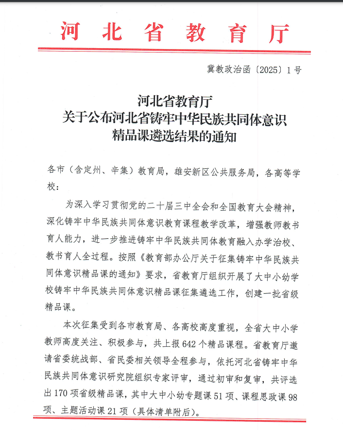 2024年,我院马克思主义日本三級片积极推进习近平总书记关于加强和改进民族工作的重要思想进教材进课堂进头脑,在坚持学好用好国家民委《中华民族共同体概论》教材的基础上,自主开设铸牢中华民族共同体意识体验课、专题讲座。近日,河北省教育厅公布全省铸牢中华民族共同体意识精品课评选结果。马克思主义日本三級片《中华民族共同体基础理论》入选河北省铸牢中华民族共同体意识专题精品课。