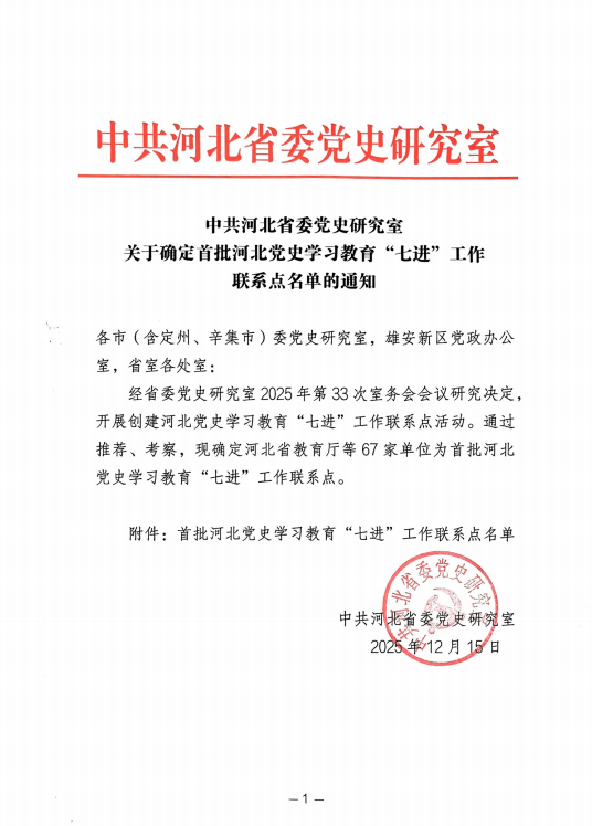 发布时间:2025-12-182025年12月15日,中共河北省委党史研究室公布首批河北党史学习教育“七进”工作联系点,我院依托同向同行实践教学基地推动学校成功入选全省67家联系点之一。这一成果是省、市党史研究室对我院思政育人成效的高度认可,也是学校思政工作与党史学习教育深度融合的标志性突破。