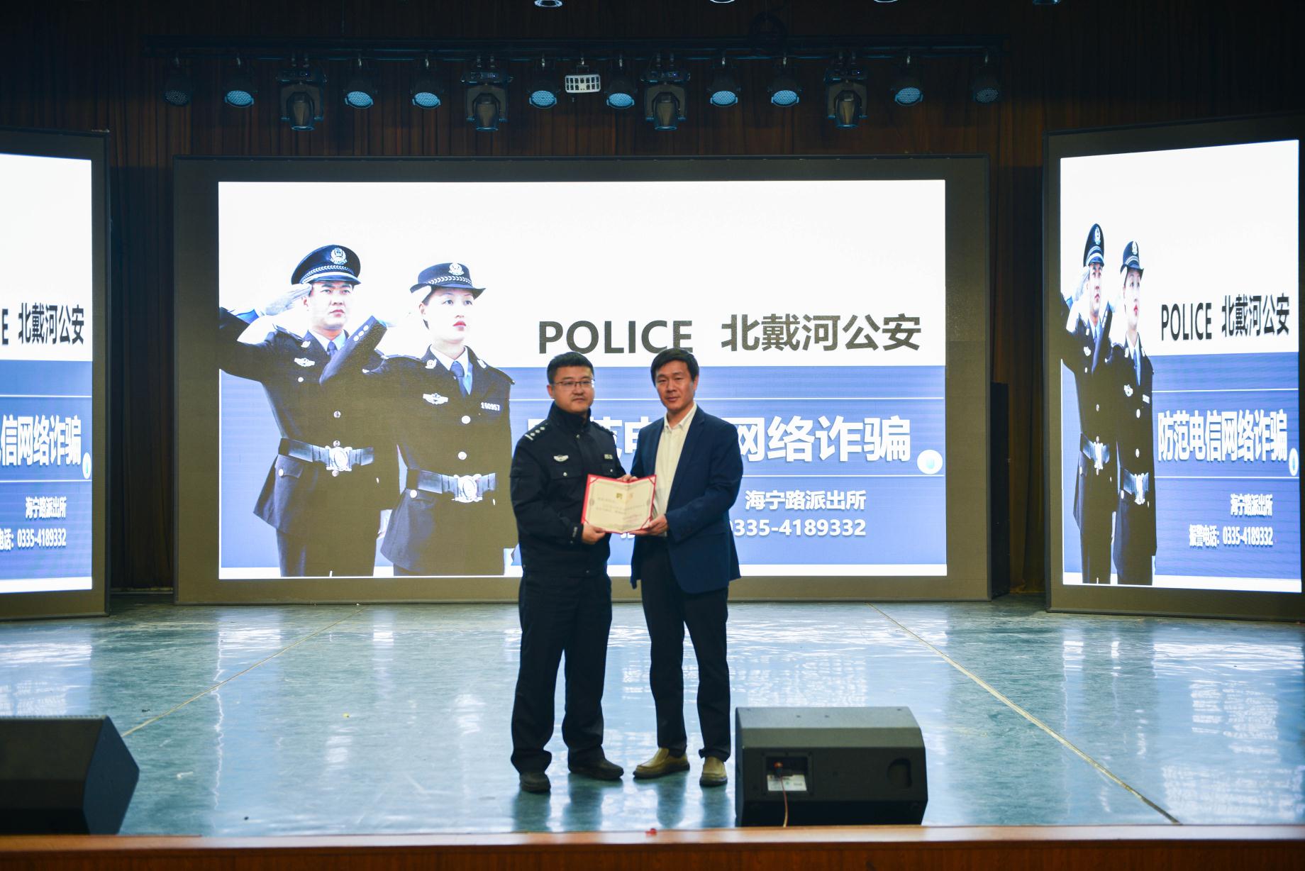 启动仪式首先由姜子旭针对近期发生在我院学生身边的真实案例,生动形象的讲解了电信网络诈骗的主要手段和新特点,结合学生群体特点详细分析了受骗原因,起到了良好的警示作用。随后李英杰针对当前学生犯罪案件的具体事例,通过讲法律、讲故事、案例分析的形式,详细阐述了违法犯罪对个人成长造成的危害。两位警官的讲解深入浅出,语言生动有趣,使同学们充分认识到日常生活中存在安全风险和知法懂法的重要性,受到同学们的广泛好评。随后王英刚向李英杰颁发了外语系安全顾问聘书。