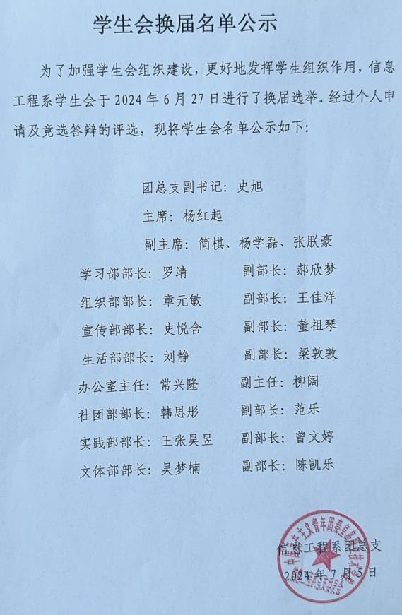 2024年6月27日,信息工程系第二十三届学生会换届大会如期举行。出席本次换届大会的成员有:信息工程系团总支书记黄嵘、辅导员陈琦、信息工程系学生会全体成员。
