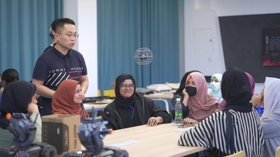 在实践体验环节,董礼逐步指导留学生进行无人机起飞、悬停、转向,机器人前进、后退等基础操作。在反复的练习中,留学生们逐渐掌握了各种机器人的操作技巧,认真完成了每一项操作任务。活动现场气氛热烈,留学生们兴致盎然。