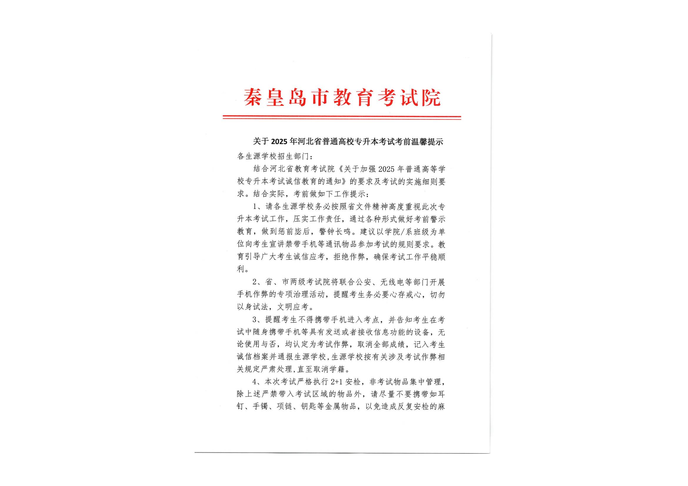 秦皇岛市教育考试院关于2025年河北省普通高校专升本考试考前温馨提示