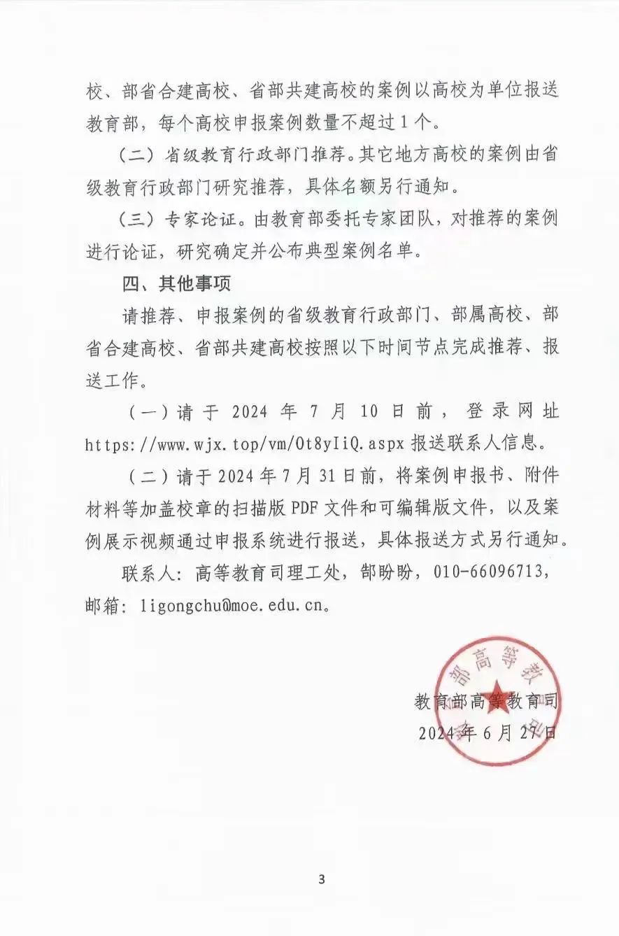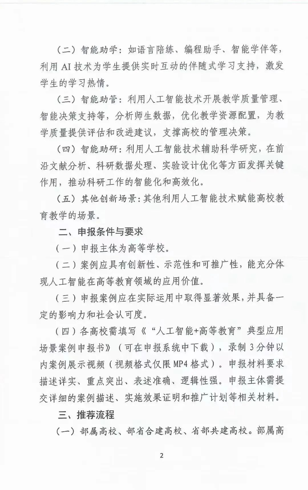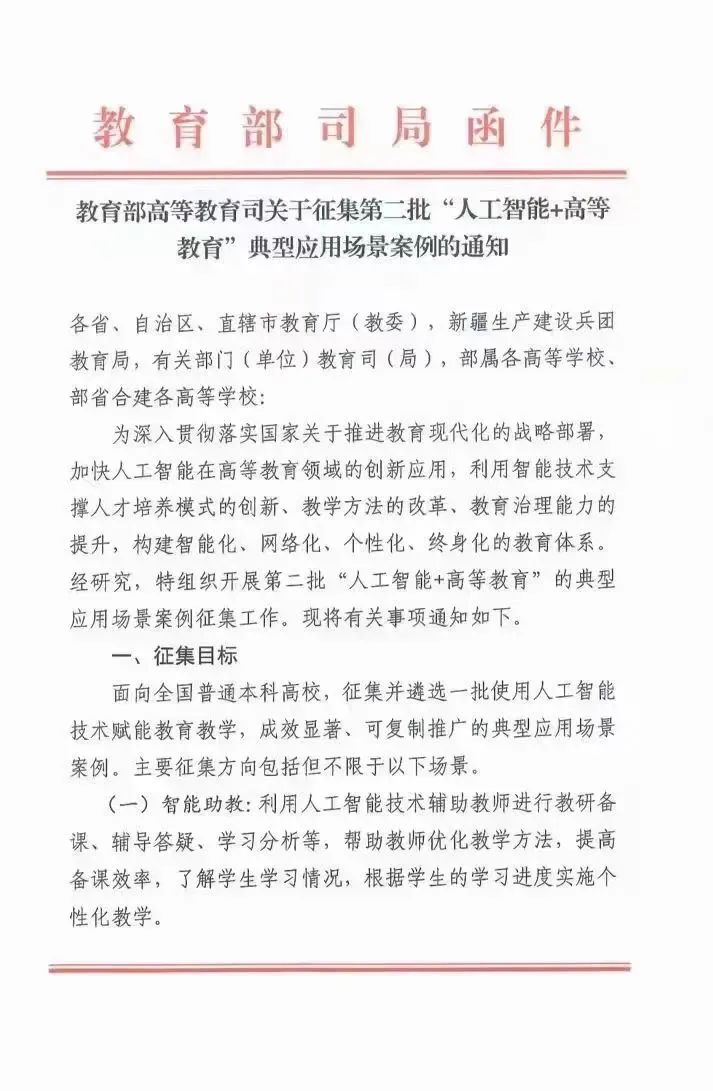 为深入贯彻落实国家关于推进教育现代化的战略部署加快人工智能在高等教育领域的创新应用,利用智能技术支撑人才培养模式的创新、教学方法的改革、教育治理能力的提升,构建智能化、网络化、个性化、终身化的教育体系。经研究,教育部高教司特组织开展第二批“人工智能+高等教育”的典型应用场景案例征集工作。现将有关事项通知如下: